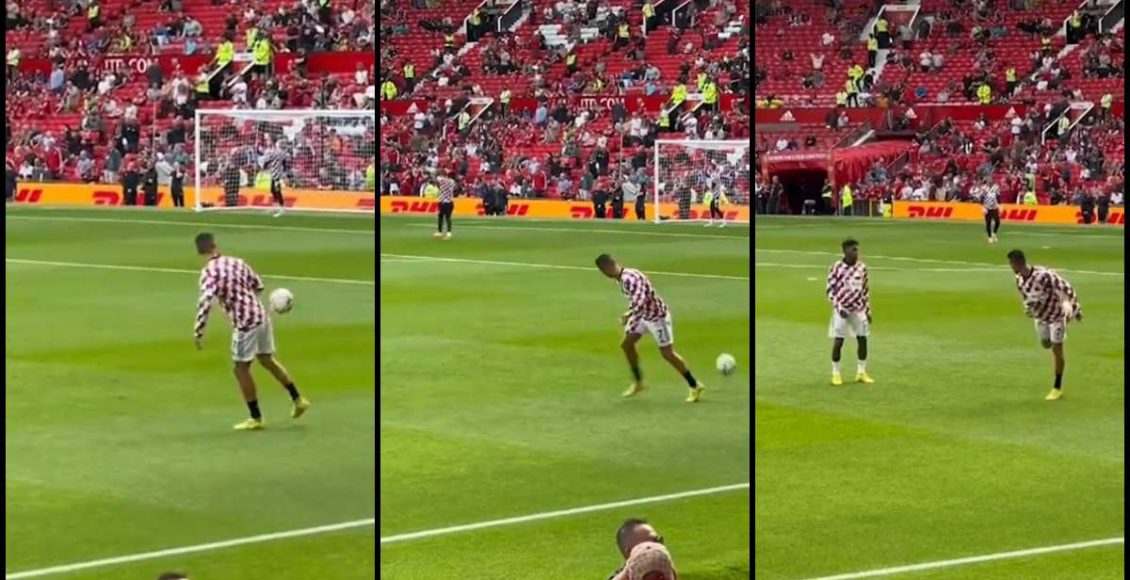 മത്സരത്തിനു മുൻപ് ബ്രസീലിയൻ താരങ്ങളായ കസമീറോ, ഫ്രെഡ് എന്നിവരുടെ ഒപ്പമാണ് റൊണാൾഡോ വാം അപ്പ് നടത്തിയിരുന്നത്. ഇതിനിടയിൽ ഫ്രെഡ് ഉയർത്തി നൽകിയ പന്ത് ബാക്ക് ഹീൽ ചെയ്യാൻ റൊണാൾഡോ ശ്രമിച്ചെങ്കിലും അതു താരത്തിന്റെ ദേഹത്തു തട്ടി തെറിച്ചു പോയി. പിന്നാലെ പോയി പന്തെടുത്ത റൊണാൾഡോ ഇതിന്റെ ചമ്മൽ മറക്കാൻ മറ്റൊരു സ്കിൽ കൂടി അപ്പോൾ തന്നെ കാണിക്കാൻ ശ്രമിച്ചെങ്കിലും അതും തീർത്തും പരാജയമായിപ്പോയി. ഇതു കണ്ടു മുഖം പൊത്തിച്ചിരിക്കുന്ന ഫ്രഡിനെയും കസമീറോയെയും വീഡിയോയിൽ വ്യക്തമായി കാണാം.