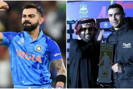 സൗദി അറേബ്യയിൽ തന്റെ ആദ്യത്തെ മത്സരത്തിൽ തന്നെ മാൻ ഓഫ് ദി മാച്ച് നേടിയ ക്രിസ്റ്റ്യാനോ റൊണാൾഡോയെ പ്രശംസിച്ച് ഇന്ത്യൻ ക്രിക്കറ്റ് താരം വിരാട് കോഹ്ലി. ലയണൽ മെസി, നെയ്മർ, എംബാപ്പെ തുടങ്ങിയ താരങ്ങൾ അണിനിരന്ന പിഎസ്ജി ടീമിനെതിരെയാണ് റിയാദ് ഇലവന് വേണ്ടി ക്രിസ്റ്റ്യാനോ റൊണാൾഡോ കളിക്കാനിറങ്ങിയത്. മത്സരത്തിൽ നാലിനെതിരെ അഞ്ചു ഗോളുകൾക്ക് പിഎസ്ജി വിജയം നേടിയെങ്കിലും റൊണാൾഡോ മികച്ചു നിന്നിരുന്നു.
