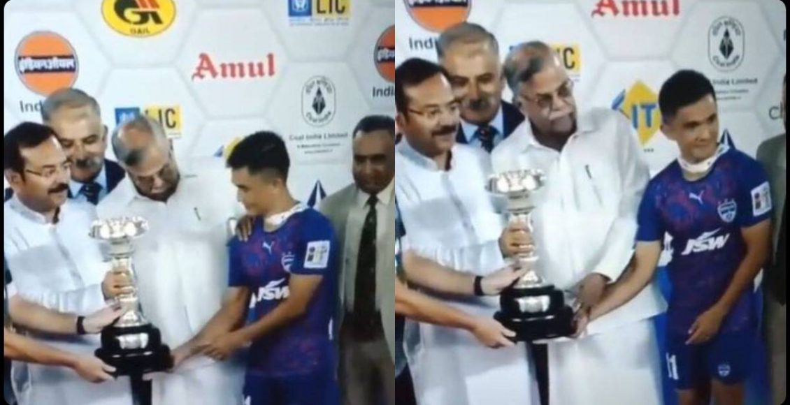 കിരീടം നേടിയ ബംഗളുരു നായകൻ ഛേത്രിയെ തള്ളിമാറ്റി ബംഗാൾ ഗവർണർ, ഇന്ത്യൻ ഫുട്ബോളിനിത് അപമാനമെന്ന് ആരാധകർ